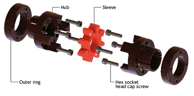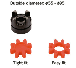 型號 | 最大孔徑 (mm) | 常用扭矩*1 (N· m) | 最大扭矩*1 (N· m) | 最大轉速 (min-1) | 慣性力矩*2 (kg· m2) | 靜態扭轉 (N · m/rad) | 偏心 (mm) | 偏角 (°) | 軸向偏差 (mm) | 質量*2 (g) | 彈性間隔體硬度 (JIS) |